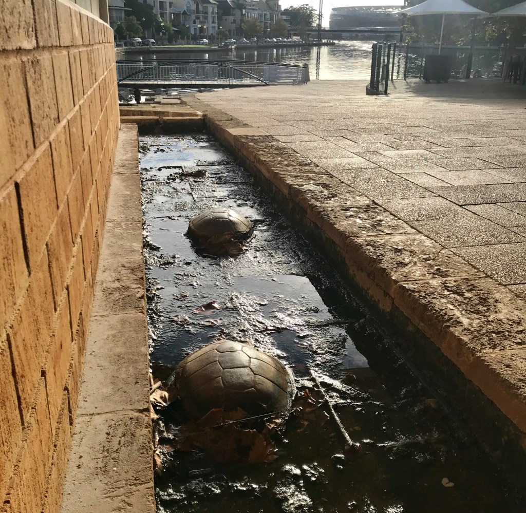 Pic above: From the studios of the ABC to Claisebrook Cove trickles the Claise Brook and along the way are the turtle shell sculptures, popular with ducks for a rest and for kids looking for the challenge of jumping on their backs.