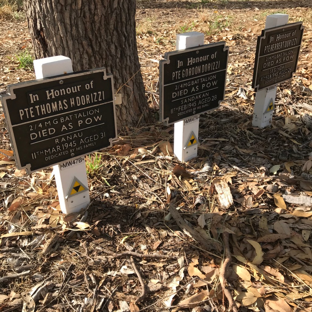 The Sandakan Memorial in Kings Park is tucked away behind the Kings Park Tennis Club and remembers the more than 2400 Prisoners of War, including 137 Western Australians, who lost their lives at Sandakan and on the three death marches in 1945. Just a little walk away from the memorial are three plaques for the Dorizzi brothers, Herb, Tom and Gordon. These three were brothers from Toodyay who lost their lives at Sandakan and on the death marches.