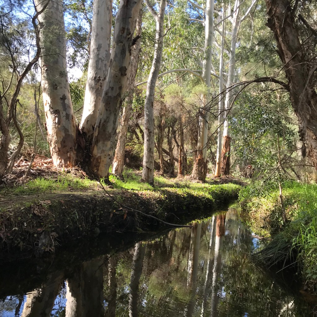 In Mid-Summer Nights Dream, Shakespeare describes a character as “though she be but small she is fierce”.  This is like Bull Creek Park.  As Bull Creek flows towards the Canning River, it is surrounded by a small piece of bushland.  There’s a log over the creek to walk across and a great path that requires you to push ferns out of the way and there’s bird life and enough green canopy to block out the noise of the busy city roads nearby. Interestingly, it’s very well protected by the City of Melville and you’re required to scrub and wash your boots before you enter to prevent dieback entering this small but fierce bit of bush.