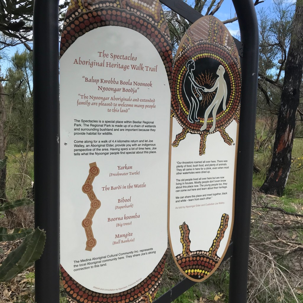 The Spectacles is 360 hectares and part of the wider Beeliar Regional Park and has great Noongar interpretative signage along a 5km heritage walk trail and explains the perspective and special importance of the area to Noongar Elder Joe Walley.