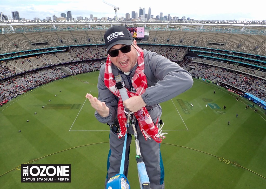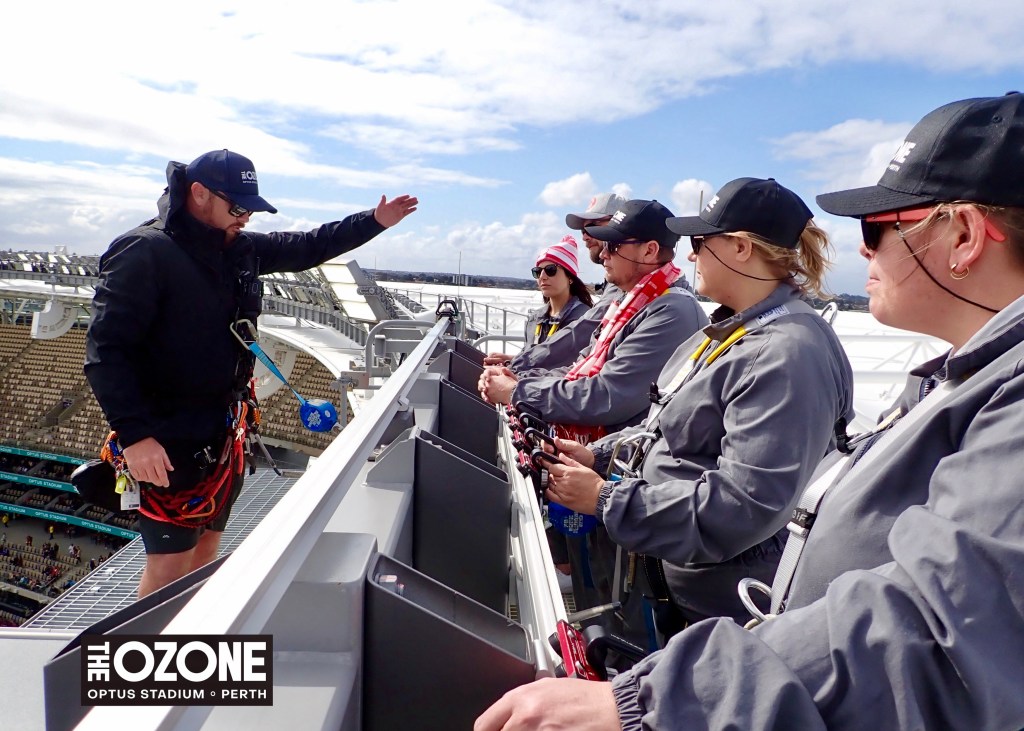 Having zipped up my Ozone ‘Ghostbuster’ jumpsuit and climbed into my harness and adjusted my straps, I walk with the other members of our merry band through the bowels of Optus Stadium, past crates of plates and all sorts of things destined for what is above. There are no lions, gladiators, Roman centurions or terracotta amphorae filled with wine, but there’s still a lot going on.