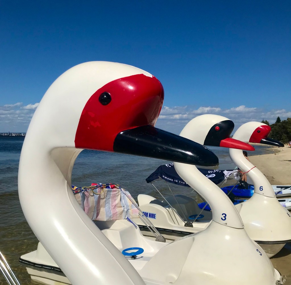 Swans: Swans on the Swan. How can life get can any better than pedalling a swan on the Swan this summer? Forget the tube of sunscreen, you’re going to need a big tube of Voltaren the following day but honestly, it’s not because they’re hard to pedal, it’s just that those muscles aren’t working out enough each day. Jeff is busy launching and retrieving his swan pedal boats and pedal boards but still has time to show me his pride and joy, a recently painted black swan that is ready to be launched this summer. I think he needs a red swan because as we all know, red means it goes faster.