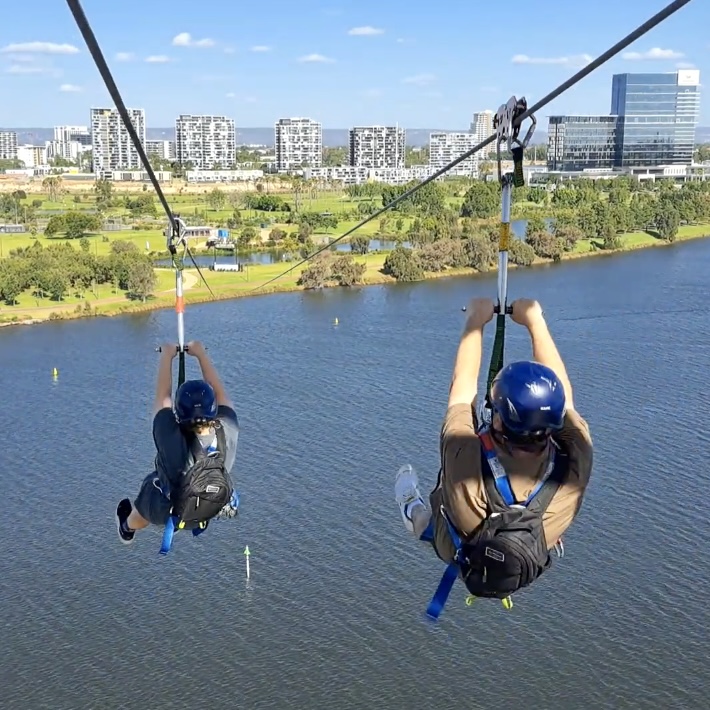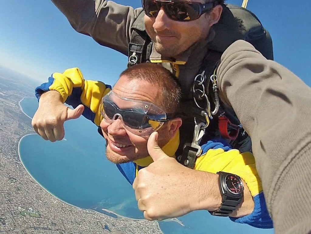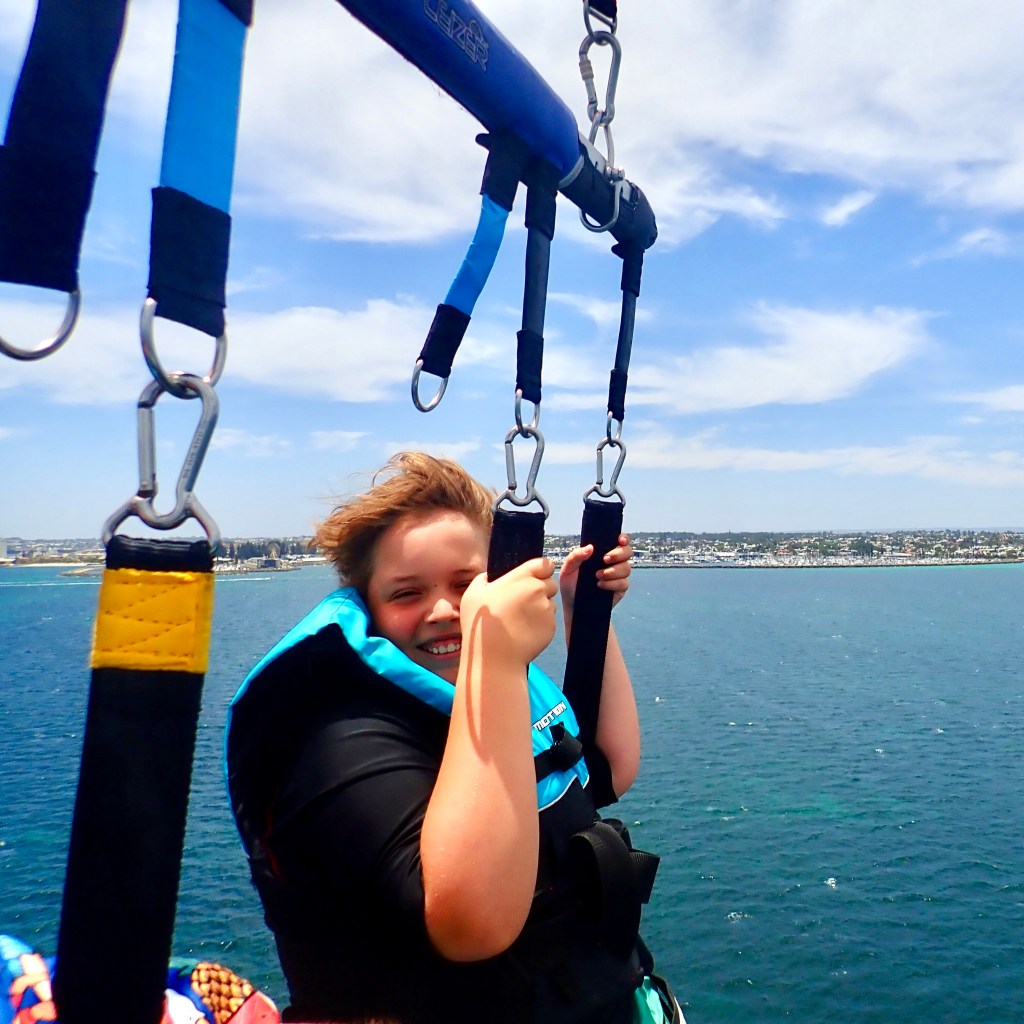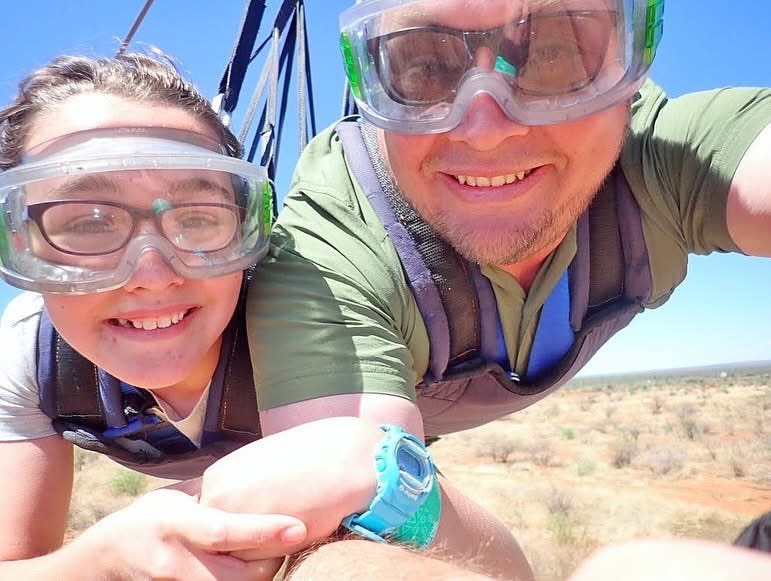 Flying a glider and looking for thermals in the air to stay in the airFlying a Spifire above the green fields of KentHot air ballooning on a cold Avon Valley morning Falling with style onto Palm BeachZiplining with Tom off Matagarup BridgeZiplining with Matilda down a mountain in South AfricaTom takes to the sky … indoorsMatilda takes to the skies in a Tiger Moth, used to train Empire Training Scheme pilots in World War IITom and I parasailing off the Fremantle coast … some big fish down there!Even a big plane is an adventure in the air
