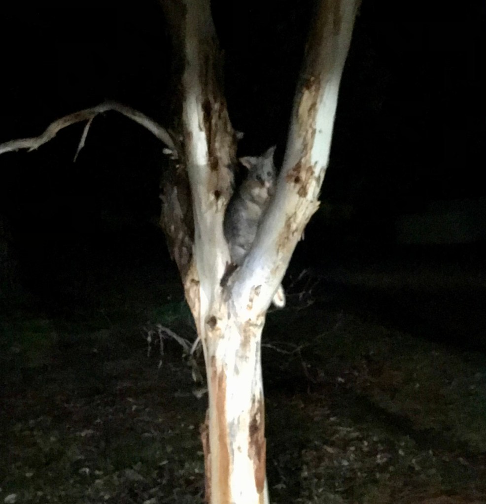 Possum spotting can be done from the back porch of your cottage or a short stroll into the surrounding bush. With an old Dolphin torch, shine it up into the trees like a World War II searchlight and if you see one, hold the light to the side as shining it into their eyes is just as annoying and horrible for their little eyes as it is for us.
